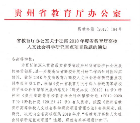转发省教育厅办公室关于征集2018年度省教育厅高校人文社会科学研究重点项目选题的通知