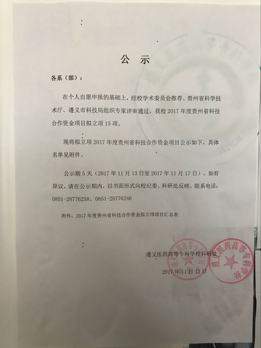 关于我校2017年度贵州省科技合作资金项目立项的公示
