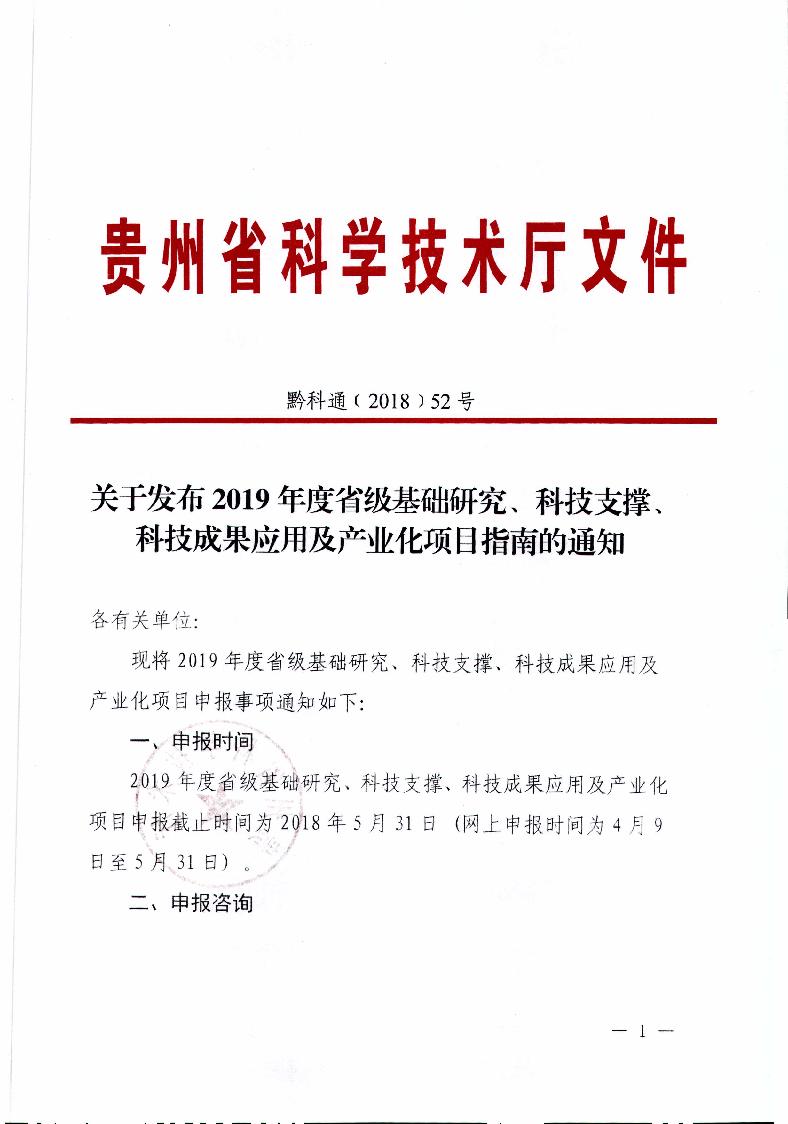 关于发布2019年度省级基础研究、科研支撑、科技成果应用及产业化项目指南的通知