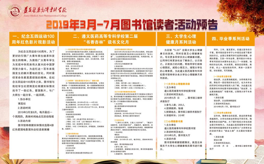 两年,三年,甚至更长,在遵义医专的日子里,图书馆在医专学子心中肯定会留下最深刻的印记,这里记录着同学们追梦的理想,拼搏的青春。又到一年毕业季,图书馆2019毕业季系列活动为本届毕业生送上了一份温暖、独特的毕业礼物。时光荏苒,离别近在眼前。离开前,约上一起泡馆的同学,再来一次图书馆,诉诉衷肠,写写青春。