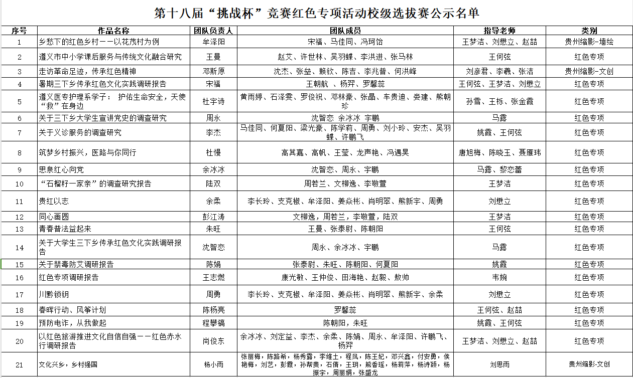 根据贵州省第十八届“挑战杯”红色专项活动竞赛有关要求,校赛收集到校系共50支项目申报,根据校赛评审按40%优秀项目推荐参评省赛要求,现将校赛评审对排名前20支项目进行公示,公示期为2023年8月22日- -8月29日, 如对名单公示人员有异议,请在公示期内向校团委提出,地点:后勤大楼二楼。