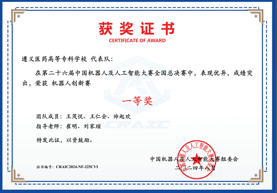 在这收获的季节里,我们迎来了一个令人振奋的消息!在刚刚结束的第二十六届中国机器人及人工智能大赛全国决赛中,我校卫生管理系的“杏林星舟”团队(指导老师:崔明、刘家瑄,参赛学生:王茂悦、王仁会、帅起欢)以其卓越的表现脱颖而出,荣获机器人创新赛组别国家赛一等奖。