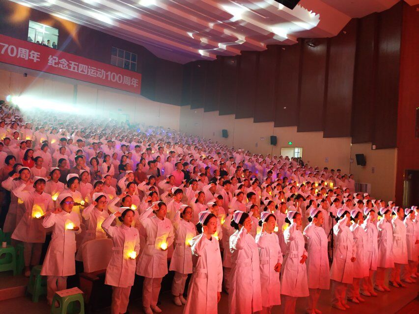 本次授帽仪式由护理系教师郭轶担任主持人,护理系党总支书记张绍军作了精彩讲话,对即将踏上实习岗位的2017级护生提出了宝贵的工作建议,并表达了殷殷期望。随着张书记的宣布,纪念5.12国际护士节暨2017级护生授帽仪式正式拉开帷幕。当罗仕蓉教授缓缓走上台,点燃蜡烛并将火种传递给2017级学生代表,那一刻,意味着每一个护生都要像蜡烛一样,燃烧自己、照亮别人;当授帽老师们依次为学生代表戴上燕帽,那一刻,意味着所有护生的肩上多了一份责任和病患的希望;当全体师生起立并跟随张豫平老师一起宣誓:“以救死扶伤、防病治病,实行社会主义的人道主义,全心全意为人民服务为宗旨,履行护士的天职.......”,那一刻,意味着每一个护生都许下了继承和弘扬南丁格尔精神的庄严承诺;当全体护生唱响悠扬的南丁格尔之歌,那一刻,意味着他们将把这份使命融入到琐碎而伟大的护理工作。庄严的授帽仪式让人心生敬畏,充满感情的礼仪展示和歌舞勾起了同学们同窗两年的回忆,来自2018级学弟学妹的祝福视频更让即将离校的准护士们内心感动和斗志昂扬,整场晚会既神圣又充满温情。
