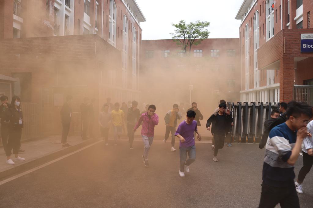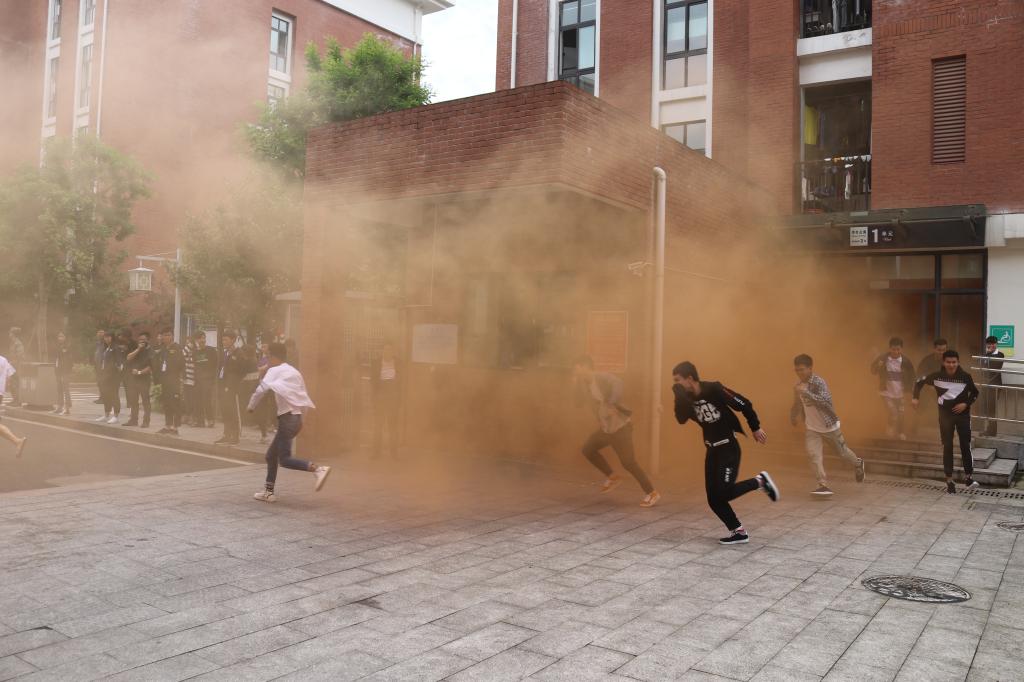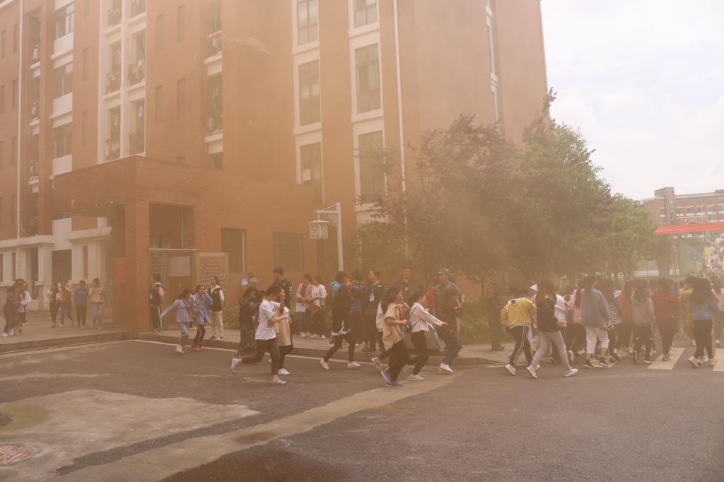 此次活动由保卫处、学生处、宣传部、后勤管理处、物业公司等联合组织。活动由学校党委委员、副校长郝刚任演练总指挥。中午13:00,指挥长下达命令,演练正式开始。学生公寓区的每个楼层浓烟滚滚,应急逃生疏散演练拉开序幕,4千多名学生在辅导员、宿舍管理员、护校队队员和国防教育师范班学生的指引下,用湿毛巾掩住口鼻弯腰迅速从安全通道撤离到安全地点。