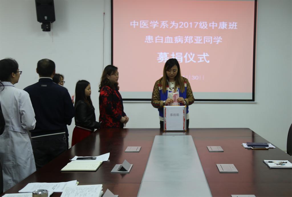 “病魔无情,人间有爱”。当中医系得知这一消息后,及时向学校请示,校领导高度重视并批准为郑亚同学组织爱心募捐活动。我校青年志愿者协会第四分会在校领导的大力支持下,得到校学生处、校团委积极支持和帮助,以及全校师生的热烈响应,在全校范围内积极开展了募捐活动。