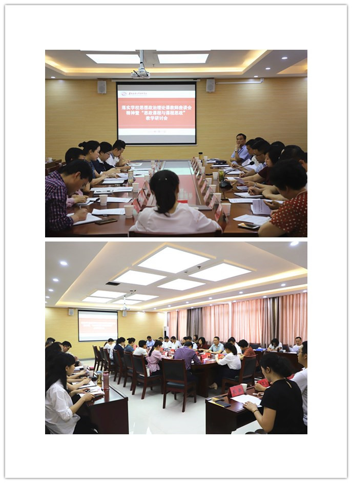 6月13日下午,我校在马克思主义学院多媒体会议室召开落实学校思想政治理论课教师座谈会精神暨“思政课程”与“课程思政”教学研讨会,校党委书记孙逐、副校长冯春林出席会议,教学处、宣传部、各教学系部负责人及马克思主义学院全体教师参加会议,各教学系部选派“课程思政”优秀教师作交流发言,会议由马克思主义学院院长邓山主持。