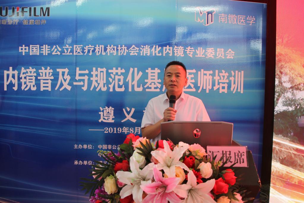 2019年8月3日,中国非公医疗机构协会消化内镜专业委员会内镜普及与规范化基层医师培训启动仪式在遵义市第五人民医院(医专附院)内科楼阶梯教室举行,遵义市卫生健康局局长刘勇、清华大学北京长庚医院内科部部长、消化中心主任姜泊,北京大学第三医院消化科副主任、消化内镜中心主任黄永辉,遵义医科大学附属医院消化病医院院长庹必光,贵州省人民医院内镜科主任李红灵,中国人民解放军北部战区总医院内窥镜科副主任杨卓,中国中医科学院西苑医院内镜中心主任蔡毅东,中国非公立医疗机构协会消化内镜专业委员会副主任委员张博,上海市第一人民医院消化科副主任医师、遵义市消化病临床医学中心执行主任程礼,遵义市第五人民医院(医专附院)党委书记、院长王平,遵义市第五人民医院(医专附院)消化内科主任、遵义市消化病临床医学中心副主任郑义,遵义市第五人民医院(医专附院)院领导班子及全市各级医疗机构300余名同仁参加启动仪式。仪式由遵义市第五人民医院(医专附院)副院长张文娟主持。