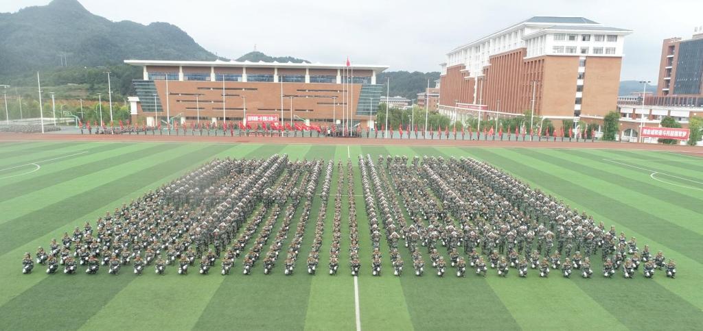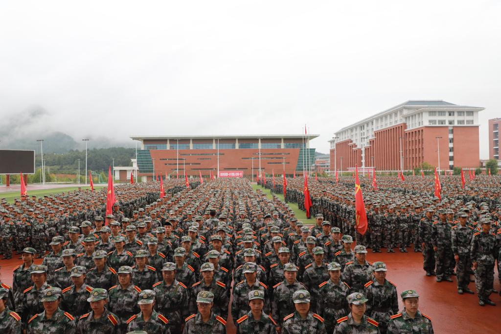 首先进行的是新生军训汇报,风雨操场上5443名新生排列成5个营64个连,70位教官各自站立在自己连队前面,其中20位是医高专的退伍军人。伴随着嘹亮的国歌声,鲜艳的五星红旗冉冉升起,2019级学生军训汇报拉开了序幕。