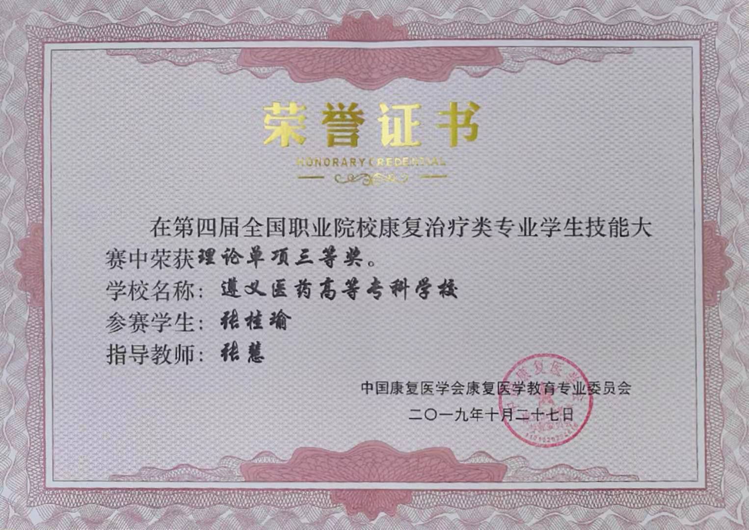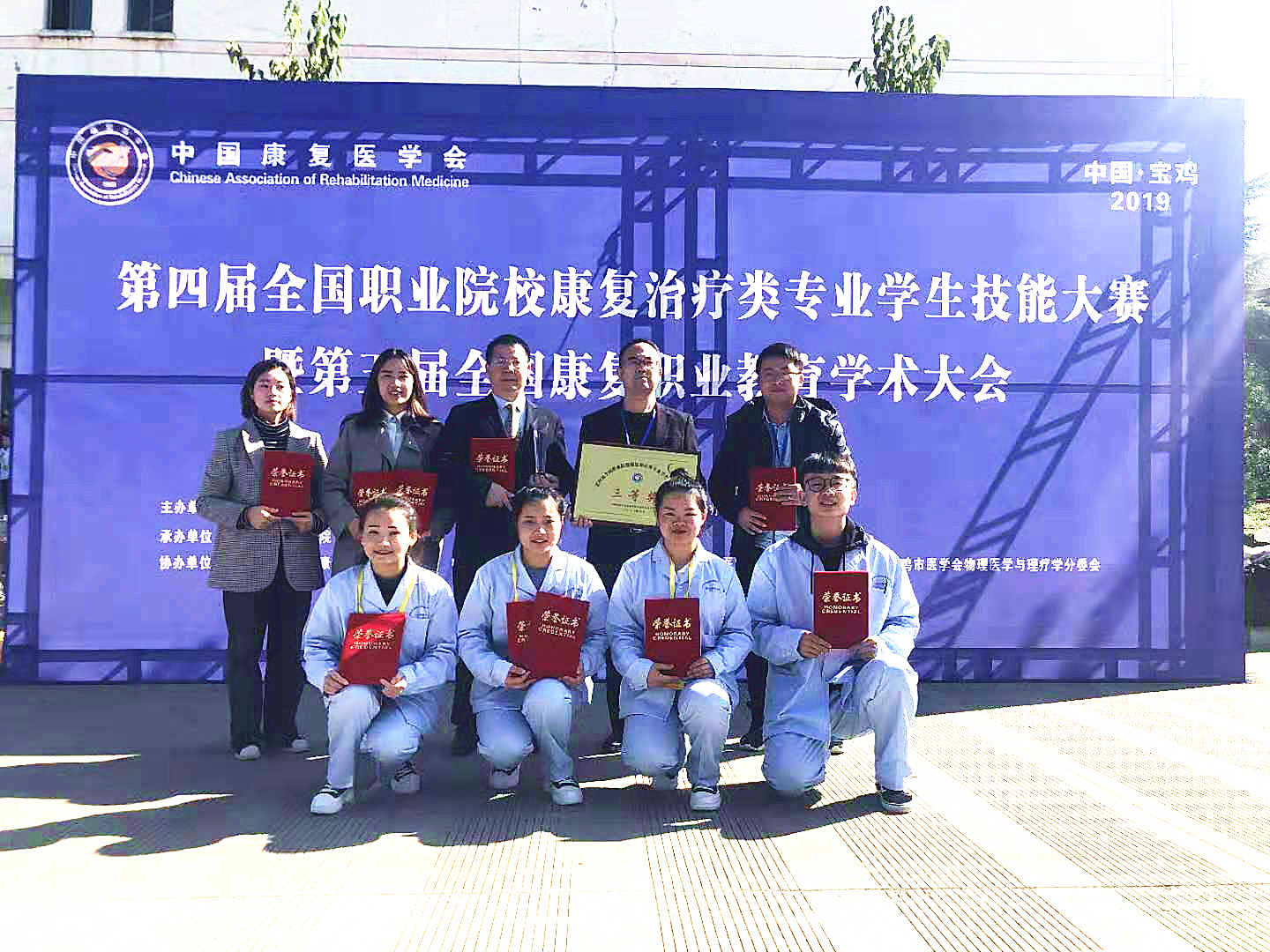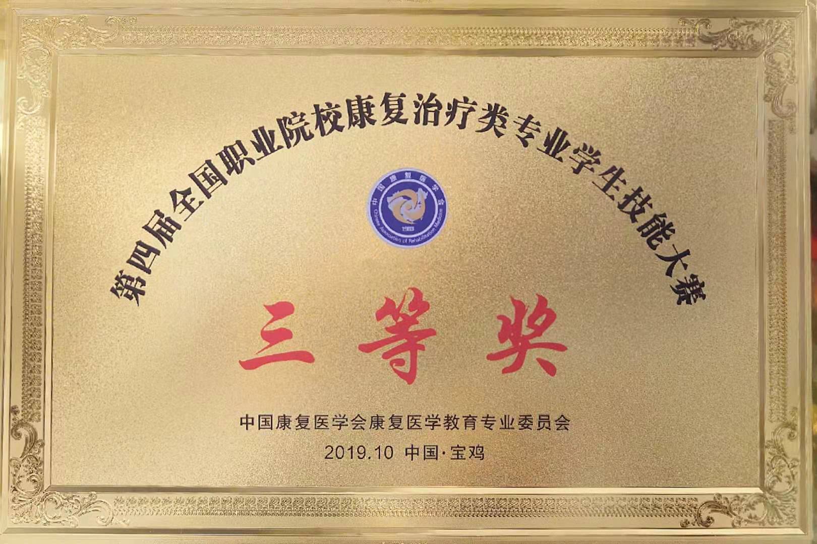 由中国康复医学会主办 ,宝鸡职业技术学院承办的第四届全国职业院校康复治疗类专业学生技能大赛于2019年10月25日-27日在陕西省宝鸡市宝鸡职业技术学院举行,一共有来自全国23个省市的71个院校参加。我校中医系派出领队王农银,康复技能指导教师张润洪 ,杨龙驹 ,张慧,陈旭和参赛学生朱远芳,张桂瑜,袁梅,叶祚晖,经过2天紧张的理论与实践操作技能比赛,我校获得团体三等奖一项,张桂瑜获个人理论三等奖一项。