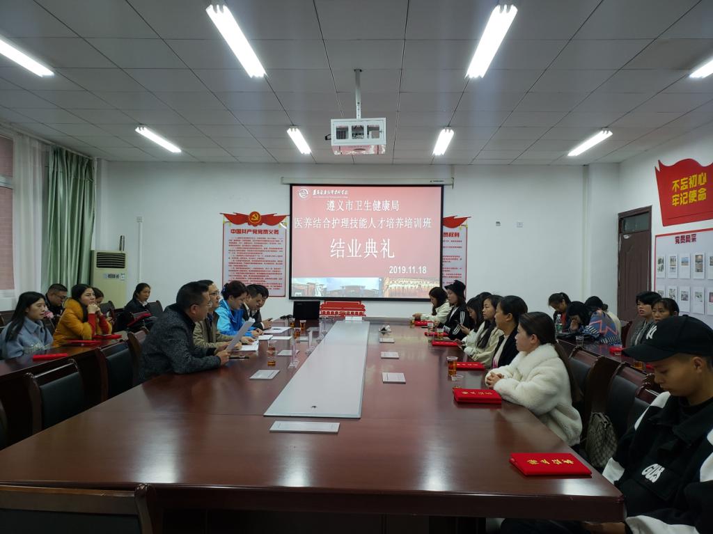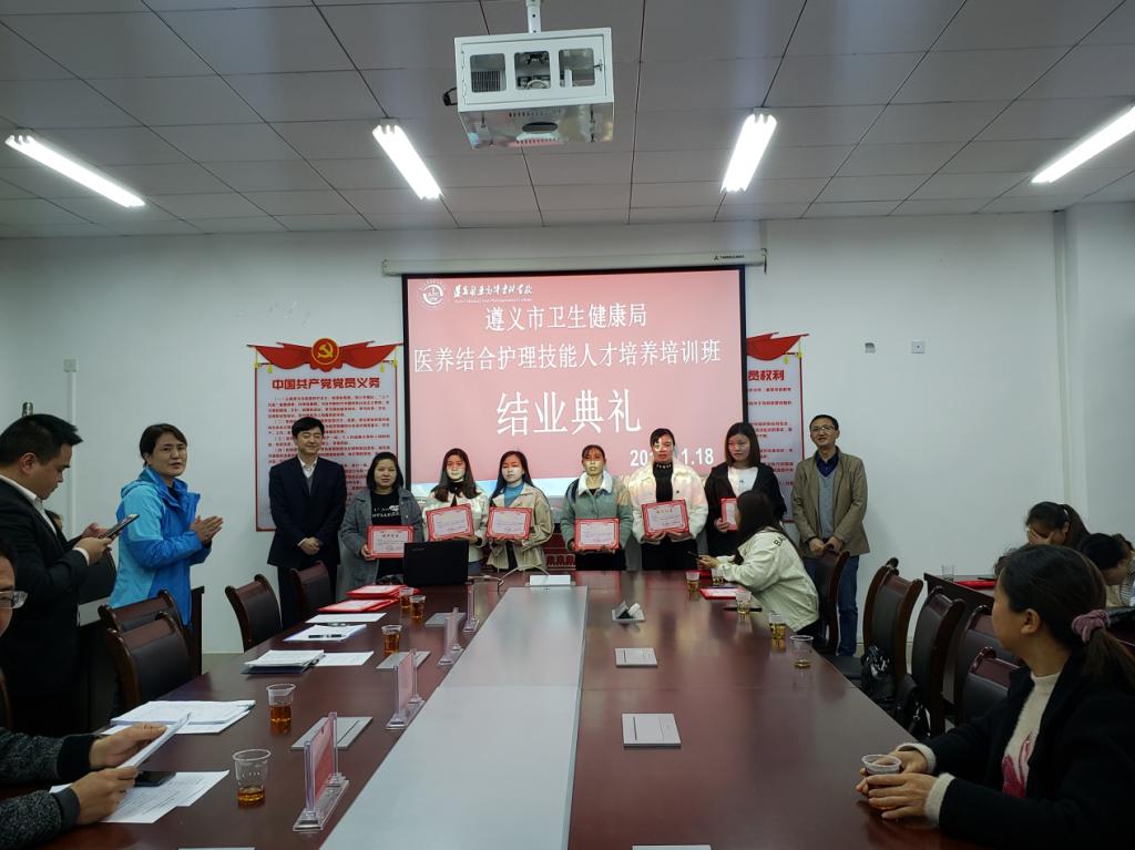 11月18日上午9:00,我校遵义市卫生健康局医养结合护理技能人才培养培训班(第一期)结业典礼在护理系A209会议室隆重举行。遵义市卫生健康局家庭发展与老龄健康科科长张全科同志,护理系主任罗仕蓉老师,护理系王娜老师,贵州省康健阿福物业管理有限公司副总经理出席结业典礼。参加结业典礼的还有遵义市卫生健康局、护理系和继续教育处相关负责同志以及培训班全体学员。仪式由继续教育处王立远主持。