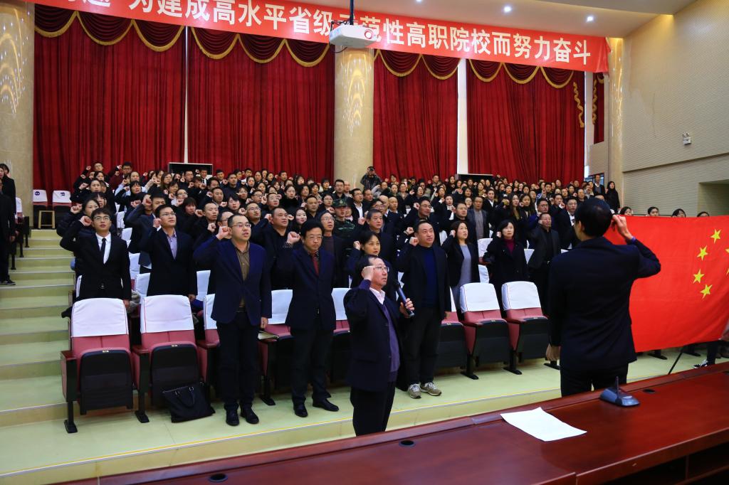 11月29日下午,学校以“弘扬宪法精神,推进国家治理体系和治理能力现代化”为主题,组织校领导班子、全体中共党员、全体专职辅导员和部分学生代表在图书馆三楼学术报告厅,举行了庄严的宪法宣誓活动。奏唱国歌之后,面对鲜艳的五星红旗,在领誓人范奇元校长带领下,大家高举右手,庄严宣誓:“我宣誓:忠于中华人民共和国宪法,维护宪法权威,履行法定职责,忠于祖国、忠于人民,恪尽职守、廉洁奉公,接受人民监督,为建设富强民主文明和谐美丽的社会主义现代化强国努力奋斗!”