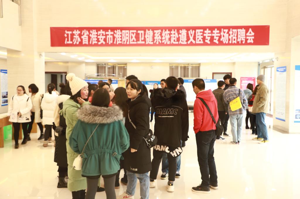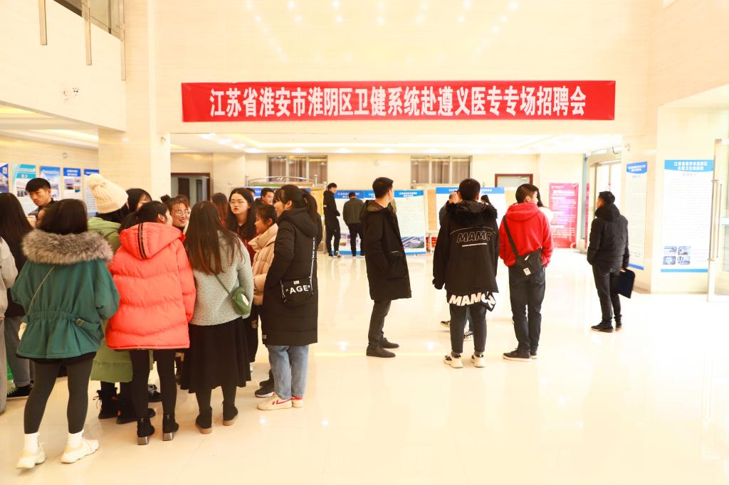 2019年12月21日上午,江苏省淮安市淮阴区卫健系统赴遵义医专专场招聘会在我校行政综合楼一楼举行。淮安市淮阴区卫健委副主任陈立宝一行亲临招聘会现场,学校党委委员、副校长岳应权全程陪同并为招聘单位领导和工作人员详细介绍了我校办学历史、专业建设、人才培养质量和毕业生就业等基本情况。