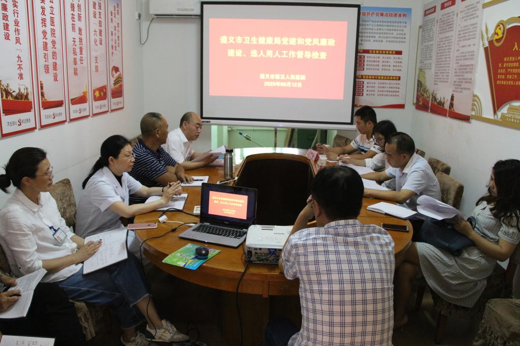 2020年6月12日下午,在遵义市卫生健康局党委委员、副局长杨跃岚带领下,由市卫生健康局机关党办工作人员袁玲同志、市第一人民医院党办工作人员杨丽同志、市中医院人事科工作人员刘兴家同志组成的督导组对我院2020年上半年党建、党风廉政建设和选人用人工作进行督导检查。院领导班子成员,党政办及纪检监察室相关人员参加了督导汇报。