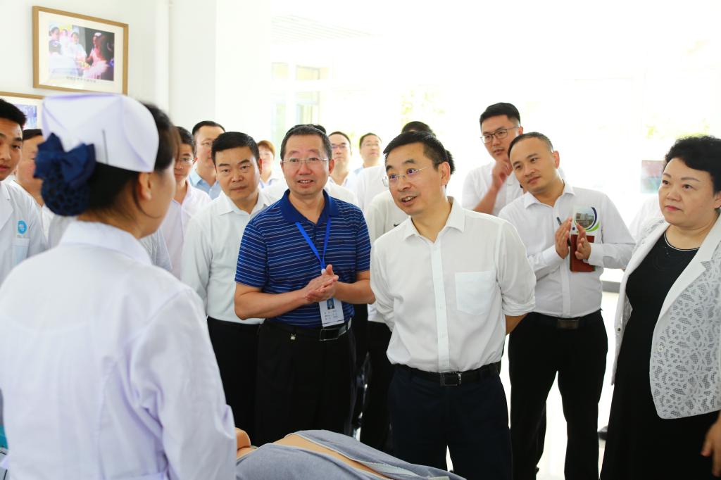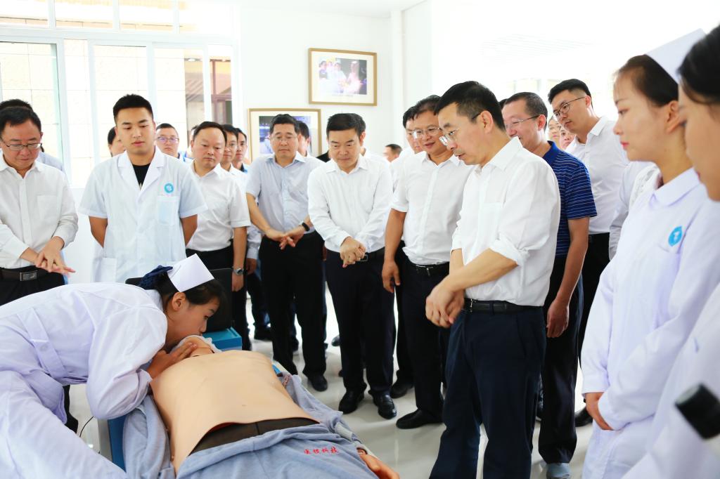 魏树旺一行深入中医系针灸实训室、推拿实训室、康复实训室,护理系现代护理开放实训基地、基础护理实训室、婴幼儿游泳中心进行现场观摩。每到一处,魏树旺都驻足观看学生实训操作,与学生亲切交谈,对我校学生现场实操表现给予高度评价,详细了解学校教育教学、师资队伍建设、实训室建设、学生就业等情况,对学校建设发展取得的成绩给予充分肯定。