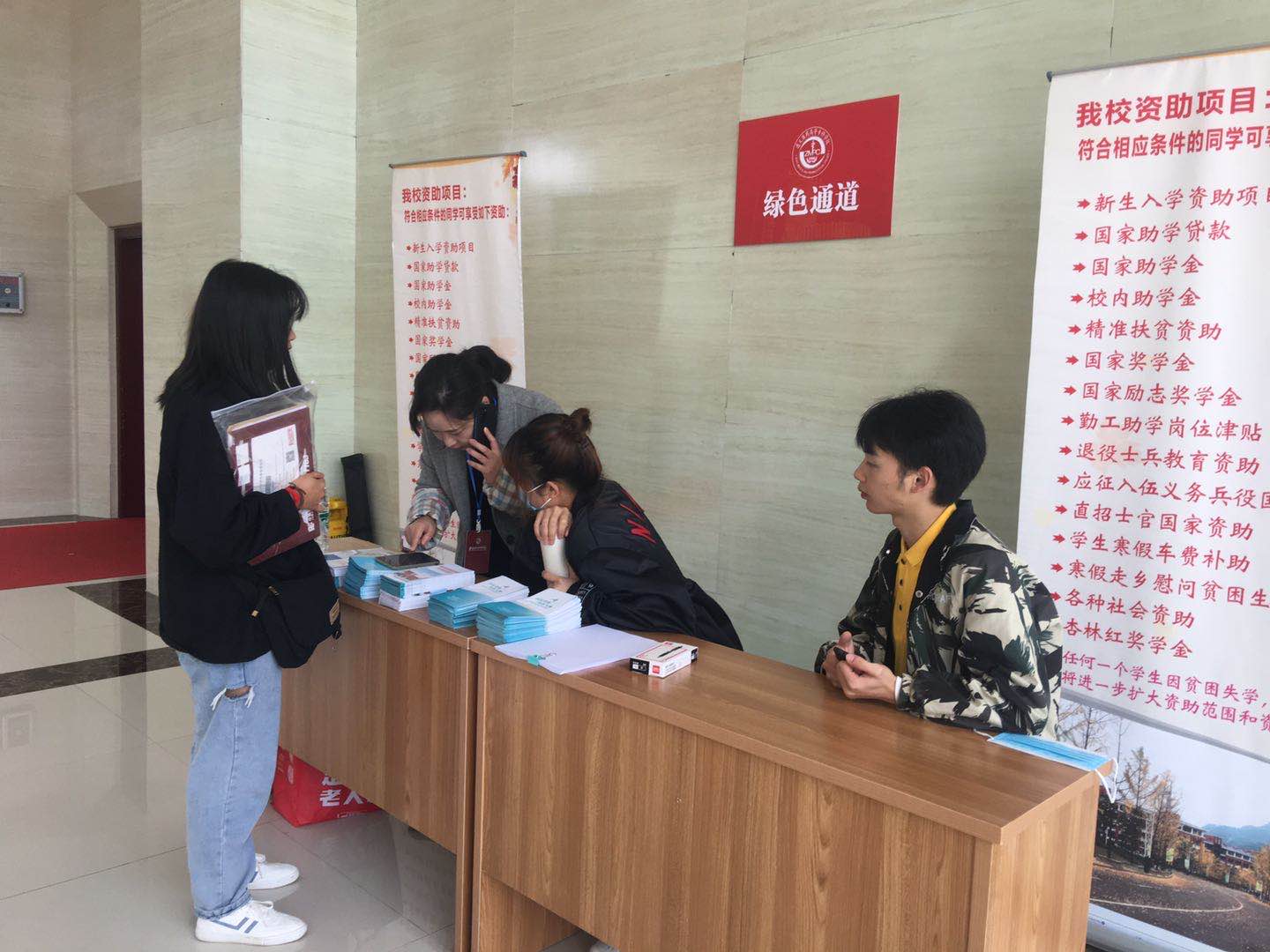 迎新现场,学校专门开辟贫困学生“绿色通道”服务岗,学生处领导详细为贫困学生讲解国家、学校的各项资助政策,介绍学校开展精准扶贫情况及成效,免除家庭困难学生的后顾之忧。