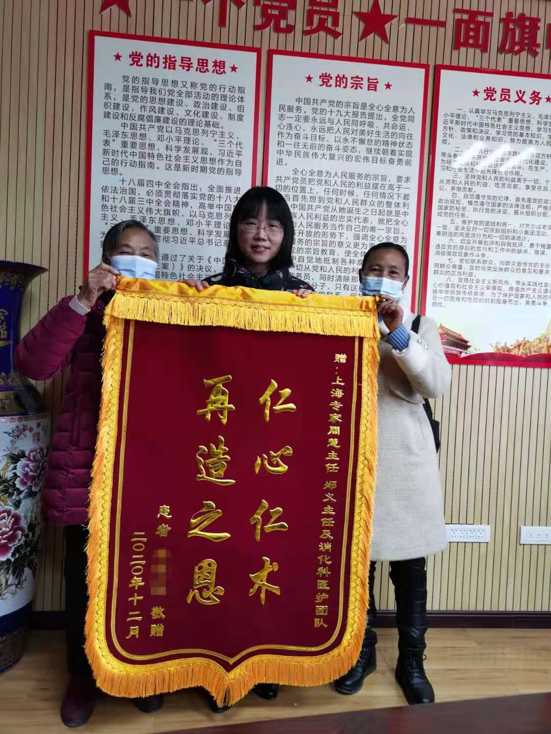 “周主任,听说你今天就要离开遵义,我们一家人特意过来感谢您,您是我们一家人的恩人啊!我们无以为报,制作了一面锦旗,感谢您的恩情!”2021年1月13日上午,在学校附院(市五医)消化内科的病房里发生了这样感人一幕,患者胡阿姨和她的母亲亲手将印有"仁心仁术、再造之恩"字样的锦旗送到了上海市第一人民医院第七批援遵专家周慧主任的手里。