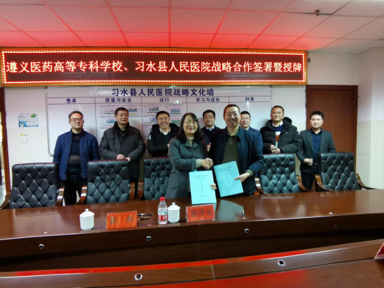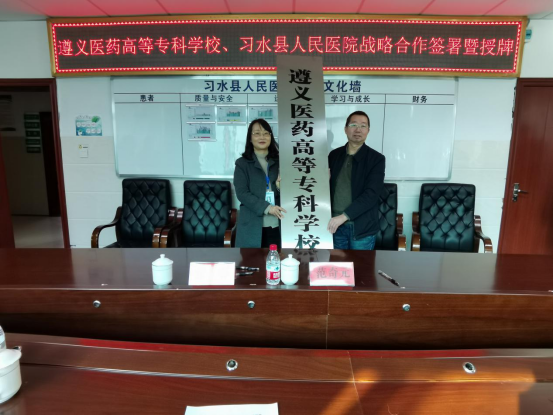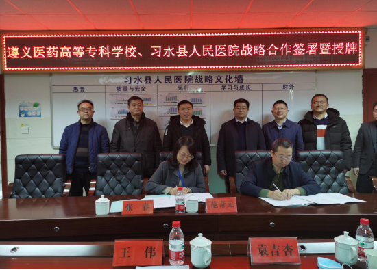 首先,王伟副县长对范奇元校长一行表示热烈的欢迎和衷心的感谢。习水县人民医院院长张春详细介绍了习水县人民医院的基本情况,范奇元校长介绍了学校的基本情况,并希望双方以这次合作为契机,共同开展协同育人的重要平台,双方要发挥各自的优势,进一步提升双方合作能力,密切共建关系,深入推动双方教育教学资源共享,打造医疗康养优质教育平台,实现互利共赢。随后,范奇元校长与人民医院张春院长签订了“校院战略合作协议”和“教学医院协议书”,并向其授予教学医院牌匾。会后,学校领导看望了我校在习水县人民医院实习的学生。