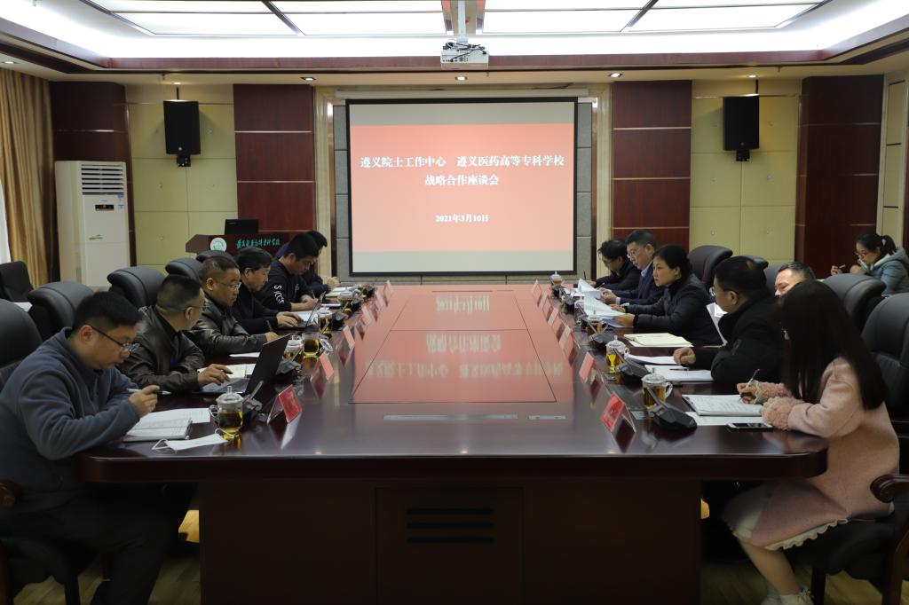 3月10日,遵义院士工作中心常务副主任刘采成带队到我校调研,并在综合楼942会议室召开双方战略合作座谈会。学校党委书记孙逐,党委副书记张武晓,党委委员、副校长覃晓龙出席座谈会,继续教育处处长张诚、科研处副处长匡晓燕、中医系党总支书记李冬梅、药学系党总支书记杨自义、护理系主任罗仕蓉参加座谈会,座谈会由学校党委委员、副校长张彪主持。