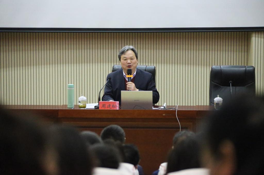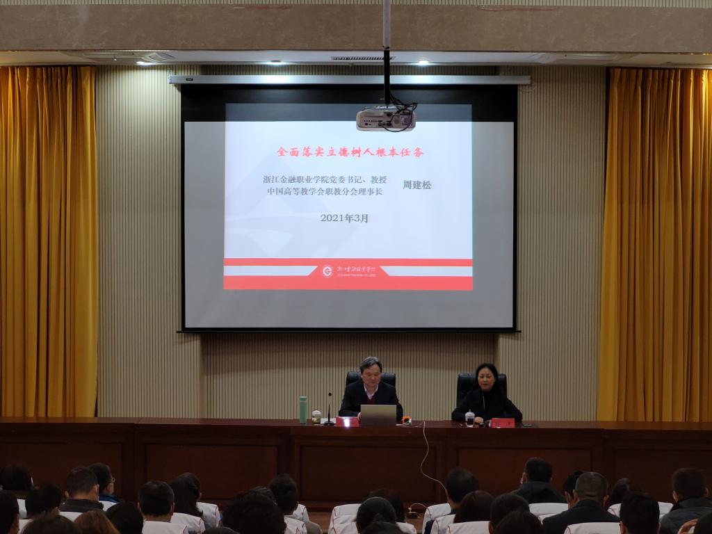 为了更好地推动我校“双高”建设工作,以先进理念引领高质量发展。3月12日,学校特邀浙江金融职业学院党委书记、教授周建松到我校作题为《全面落实立德树人根本任务》专题讲座。校党政班子成员、各处(室)、教辅单位、教学系(部、院)副科级及以上领导干部、各教学系(部、院)教研室主任(负责人)、各双高校子项目负责人及其团队成员到会聆听,会议由校党委书记孙逐主持。