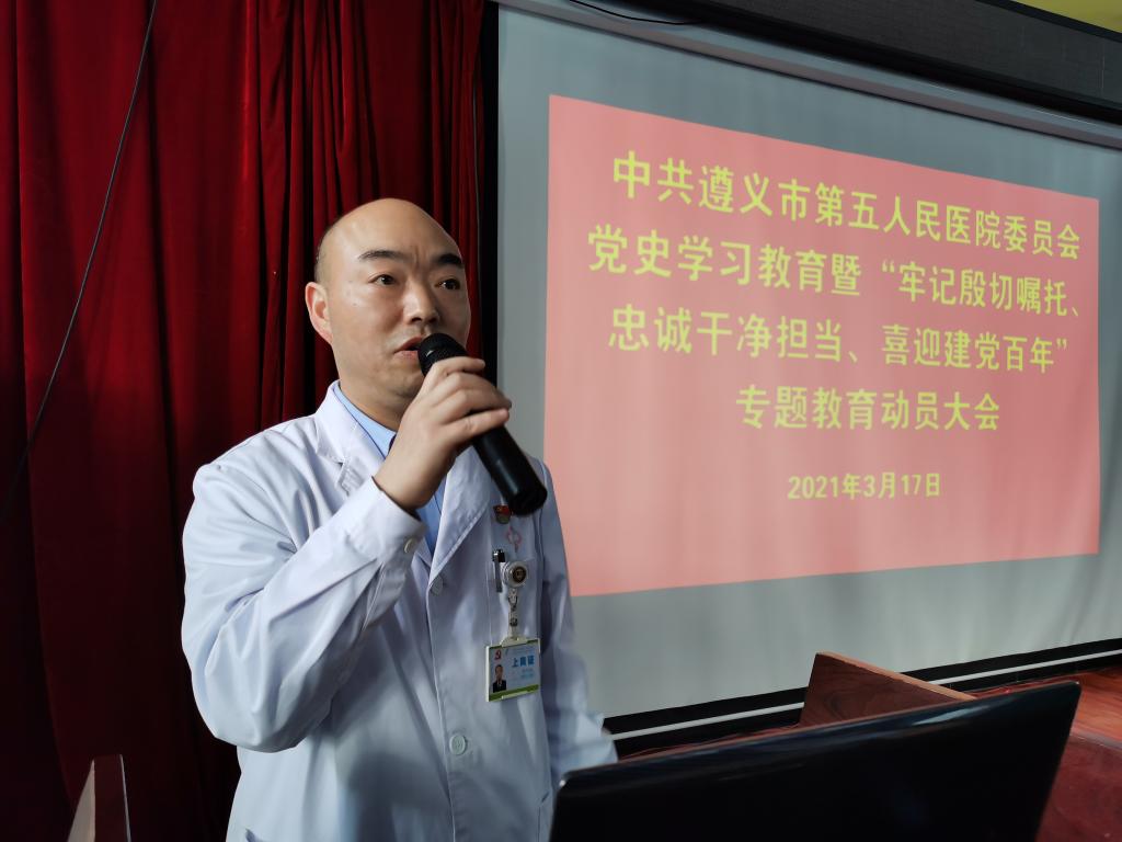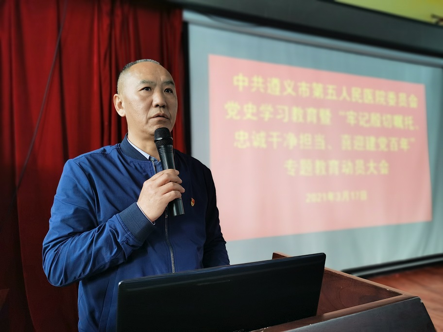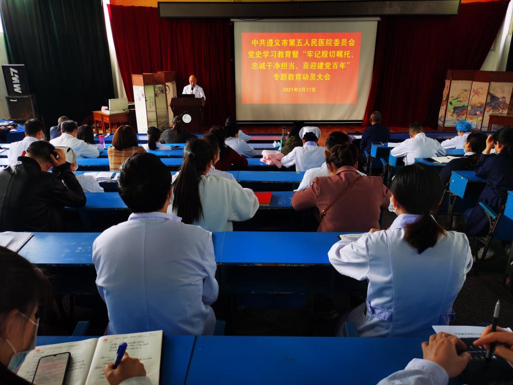 2021年3月17日,遵义市五医党委召开党史学习教育动员大会,传达学习贯彻党中央、省、市关于开展党史学习教育的会议精神,对医院开展党史学习教育进行全面安排部署,引导广大党员同志学党史、悟思想、办实事、开新局。医院党委全体委员、各党支部委员、全体党员参加了此次动员大会。党委书记、院长王平出席会议并作动员讲话。院党委副书记、副院长孙中良主持大会并宣读了《中共遵义市第五人民医院委员会党史学习教育实施方案》。