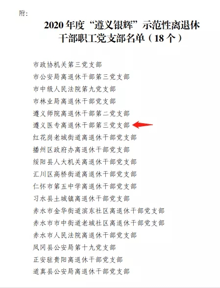 2021年3月,我校离退休第三党支部通过创建验收,荣获全市“遵义银辉”示范性离退休职工党支部称号。