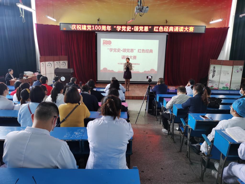 为庆祝中国共产党建党100周年,激发全院职工传承红色基因、不忘医者使命的热情,在新阶段充分展现我院广大职工昂扬向上、蓬勃奋发的精神风貌。2021年4月28日下午,遵义市五医在在内科楼阶梯教室开展了“学党史·颂党恩”红色经典诵读大赛,院领导、全院党员及全院职工参加活动。