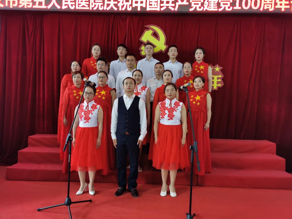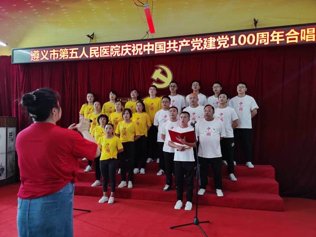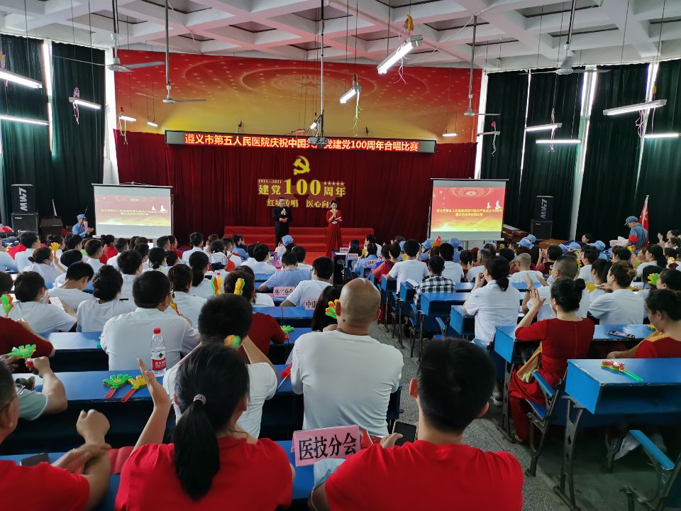为庆祝中国共产党建党100周年,讴歌党的丰功伟绩,传承党的光荣传统,2021年6月29日下午,遵义市五医在内科楼阶梯教室举办了“红歌传唱 医心向党”庆祝中国共产党建党100周年合唱比赛。