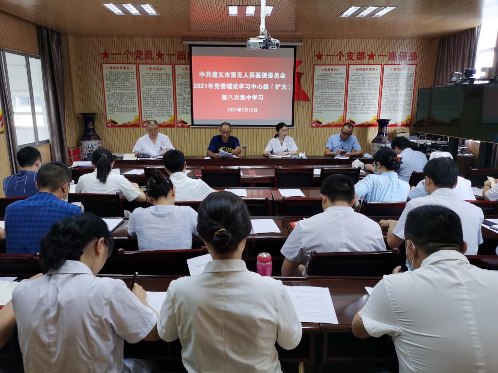 2021年7月12日,中共遵义市第五人民医院委员会在内科楼六楼会议室召开理论学习中心组扩大会议,深入学习贯彻习近平总书记在庆祝中国共产党成立100周年大会上的重要讲话精神,党委班子成员、各支部书记、各科室负责人参加学习,党委书记王平主持。