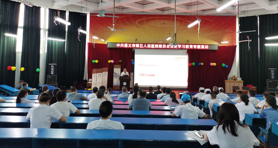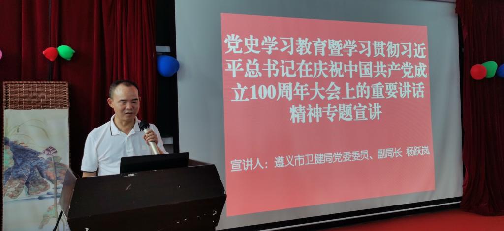 为学习贯彻习近平总书记在庆祝中国共产党成立100周年大会上重要讲话精神,扎实推进党史学习教育,8月27日,遵义市卫生健康局党委委员、副局长杨跃岚莅临我院,为全院党员干部职工开展了以《中国共产党百年辉煌》为题的党史学习教育暨学习贯彻习近平总书记在庆祝中国共产党成立100周年大会上的重要讲话精神专题宣讲。