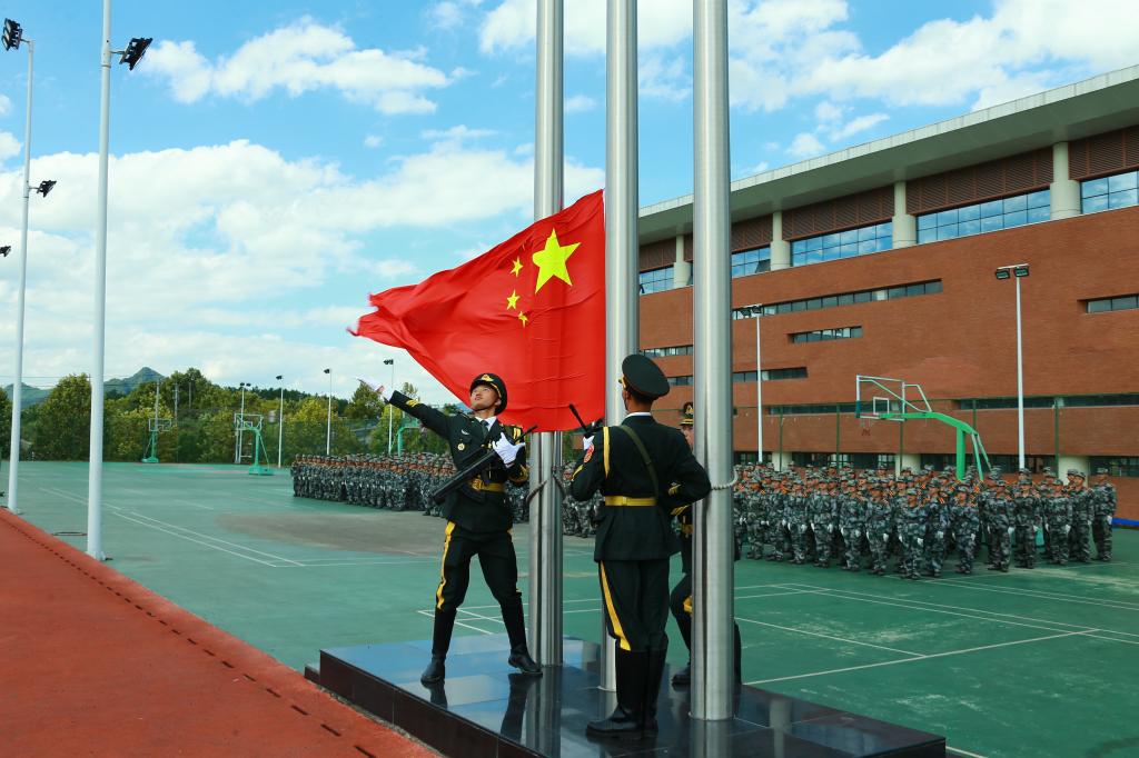 旗帜引领方向,旗帜凝聚力量。由36名成员组成的国旗班队员挺拔身姿,迈着矫健的步伐和分毫不差的标准动作护送国旗入场。伴随着一声“升国旗,唱国歌”的口令,军训汇演在庄严的国歌中正式拉开序幕,全体师生深情凝望,随着五星红旗昂首东方。