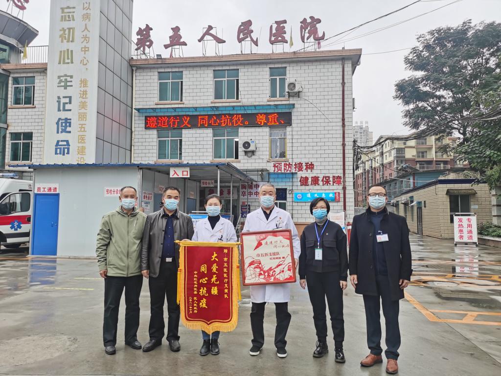 遵义市五医院党委书记王平代表医院感谢红花岗区委、区政府对遵义市五医疫情防控中所做工作的肯定,他表示新冠疫情发生以来,遵义市五医始终坚持人民至上、生命至上的原则,主动担当作为,选派优秀医务人员驰援湖北和遵义市定点救治医院,众志成城共克时艰。此次遵义市出现第一例外省关联确诊病例以来,院党委勇于担当,积极配合遵义市和红花岗区疫情防控工作部署,组建了党员先锋队,分别派出2名医生和4名护士到龙江酒店和遵义名城方洲酒店集中隔离点驻守,紧急抽调21名医务人员组成应急核酸采集医疗队,前往遵义二中、遵义市第十一中学官井校区、遵义十二中、湘江半岛、众成花园、嘉怡小区等区域开展4天3次居民核酸采集工作。20余名党员干部利用休息时间积极参与社区核酸采集维持秩序、政策宣传等疫情防控志愿服务活动。五医人用实际行动践行着初心和使命,守护广大人民群众的健康与安全。