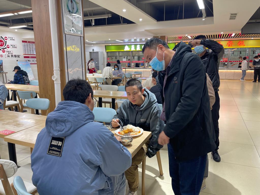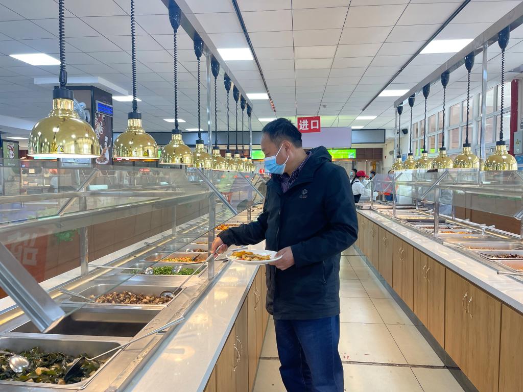 检查组一行来到学生食堂四楼称菜区域,和同学们一起排队打菜、称重付款、有序就餐,并向餐饮公司现场负责人询问菜品种类、数量、价格、供应等现状,通过陪餐的方式,深入了解学生就餐情况。用餐后,对学生食堂各楼层经营公司的食品卫生、安全生产、原材料管理、菜品质量、售卖价格、肉类配比、防疫措施等进行检查,和就餐的同学沟通交流,听取对食堂工作的意见和建议。