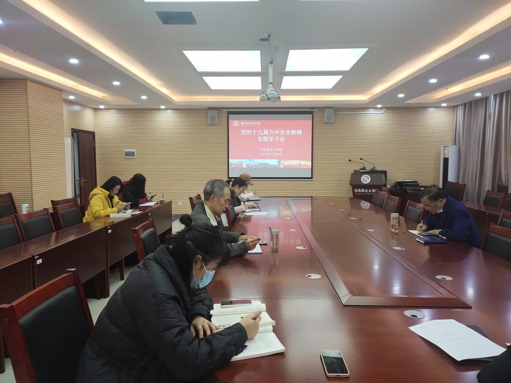 2021年11月16日,马克思主义学院组织全体教师在多媒体会议室专题学习贯彻党的十九届六中全会精神。学院党总支书记巫世瑜主持学习会并讲话。