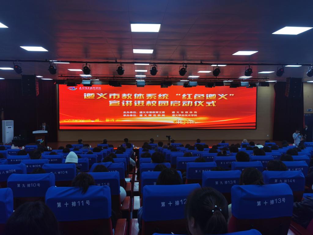 12月21日上午,遵义市教体系统“红色遵义”宣讲进校园启动仪式在遵义职业技术学院志公楼二楼报告厅举行。本次活动由遵义市委教育工委、遵义市教体局主办,遵义师范学院,遵义职业技术学院承办。遵义市委教育工委副书记、市教体局党组书记、局长周玉新,遵义市委教育工委副书记、市教育局党组成员安家兴,我校党委副书记张武晓,党委委员、宣传部长黄学军及各大高校分管领导及宣传部长出席会议。全市6所高校的300多名师生参与了此次活动。