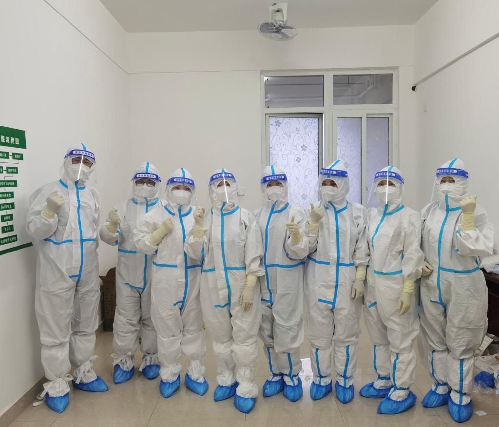 到达接管隔离点,面对已经等待的隔离观察对象和疫情严峻形势,任务艰巨超乎队员想象,但五医医疗队成员早有预案、成竹在胸,大家忍受着饥饿和疲惫,在杨燕队长,陈斌、王萍副队长的带领下,迅速投入到紧张的工作中。他们专业规范的划分为观察对象转运组、防控消毒组、健康观察组、核酸采集组、人文关怀组、信息联络组和后勤保障组,各工作组分工明确高效运转,通过查看现场环境,改进布局,从隔离区域设置到接收隔离人员路线确认,再到物资准备和工作人员生活区域整理工作,各项工作争分夺秒,工作井然有序,不到3小时,集中隔离医学观察点运行使用,开始接收隔离观察人员。