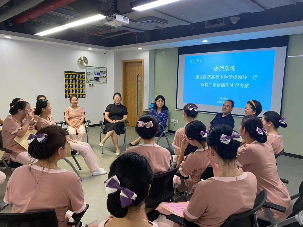 在广东伊丽汇美容科技有限公司,孙逐一行参加了学校医学美容专业实习学生顶岗实习培训结业典礼,并为顶岗实习同学颁发奖学金,与实习生亲切座谈,详细询问了学生们的工作、生活等情况。同时,孙逐一行还调研走访了伊丽汇门店及总部教学基地,与该公司负责人就产学研、人才培养、学生就业等方面的合作进一步沟通洽谈,初步达成“招生即招工、实习即就业”的校企合作协议,形成“实习-就业-创业”一体化协同育人模式,帮助学生高质量就业。
