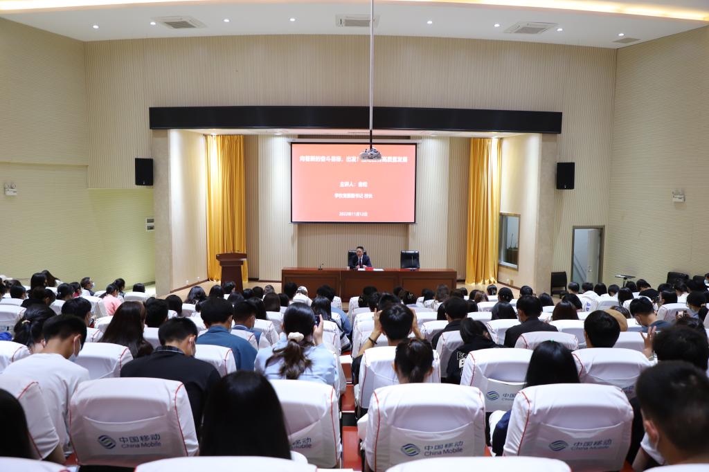 11月12日,学校党委副书记、校长俞松以《向着新的奋斗目标,出发!推动教育高质量发展》为题,宣讲党的二十大精神,并为学生讲授思想政治理论课,有关部门人员以及学生代表300余人参加活动。