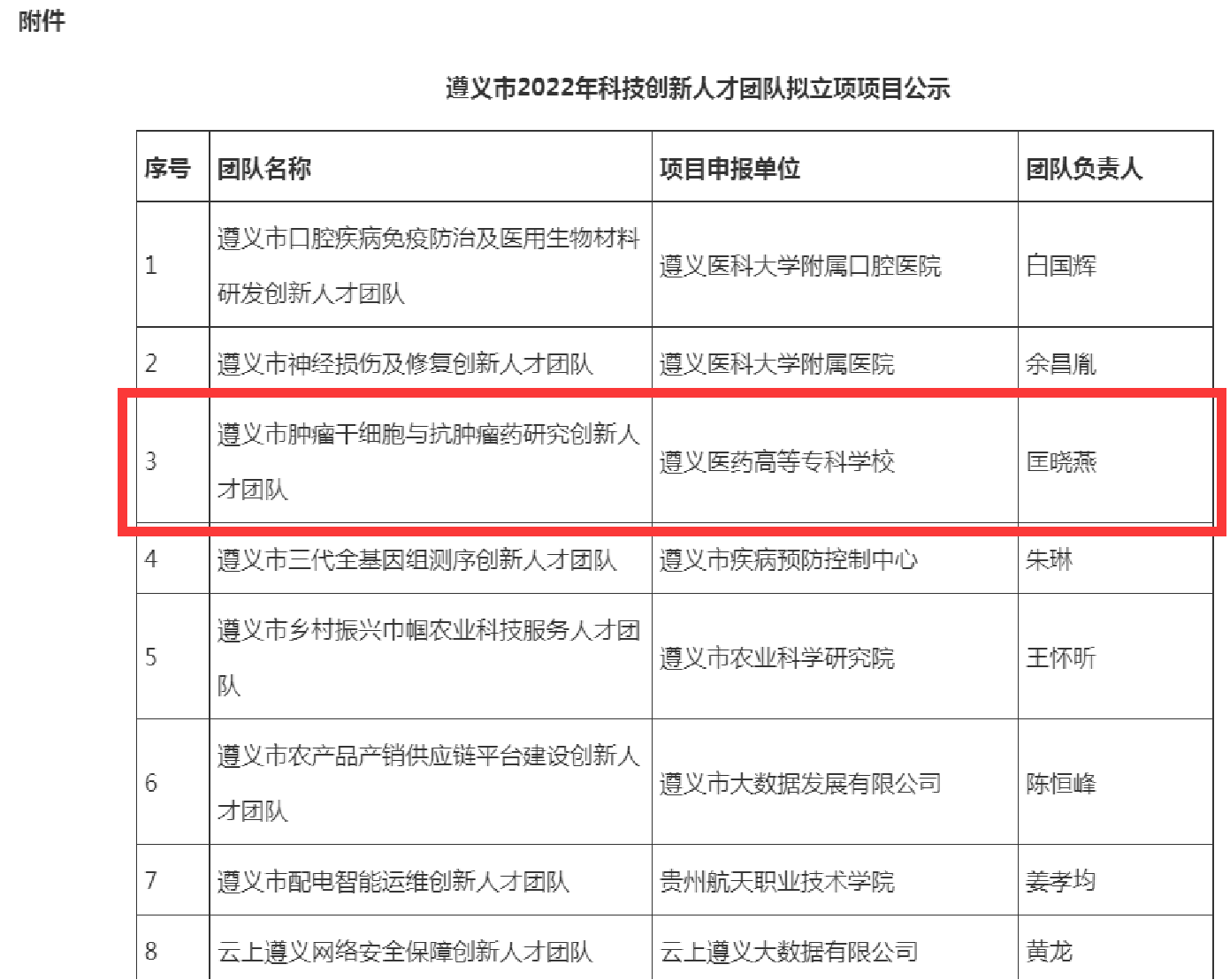 近日,遵义市科技与大数据局公布了2022年度遵义市科技创新人才团队立项名单。我校匡晓燕博士牵头的“遵义市肿瘤干细胞与抗肿瘤药研究创新人才团队”喜获立项。