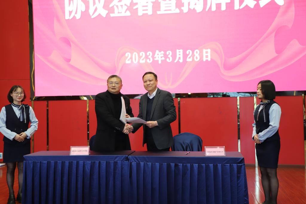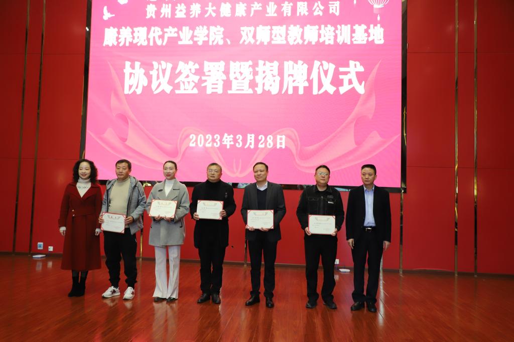 活动中,俞松、苏晴等双方代表共同为康养现代产业学院揭牌;俞松为双师型教师培训基地授牌,并为产业学院负责同志颁发聘书;学校与贵州益养大健康产业有限公司签署协议。