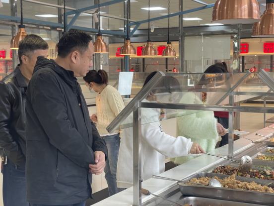 为进一步强化食品卫生安全,提升菜品质量,确保餐饮保障工作安全有序,2023年4月7日,学校党委委员、副校长岳应权带领后勤管理处相关负责人,在中午用餐高峰时段,到学生食堂各楼层进行检查。