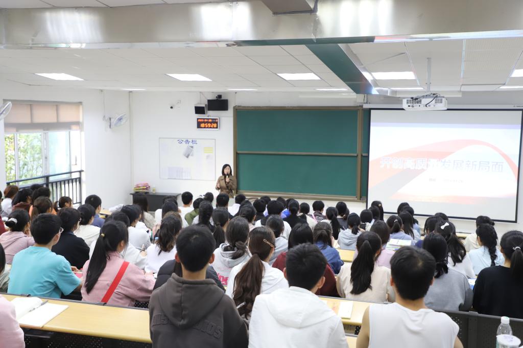 4月26日,学校党委委员,组织人事处处长魏颖在公教103为学生讲授《开创高质量发展新局面》系列的“形势与政策”思政课。