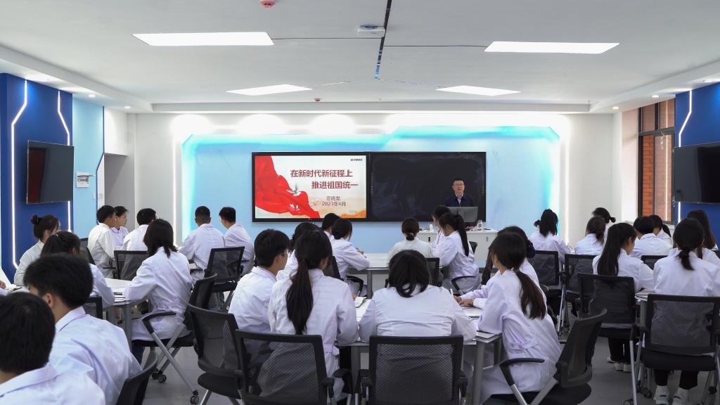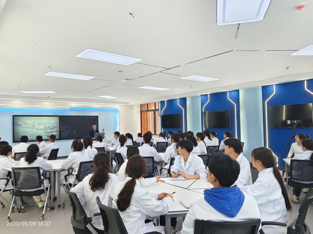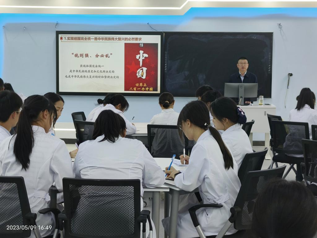 课堂气氛热烈,学生们踊跃互动,覃晓龙鼓励青年学子们响应习近平总书记的号召,立志做有理想、敢担当、能吃苦、肯奋斗的新时代好青年,要结合学科背景和专业实际,踔厉奋发、笃行不殆,为实现祖国和平统一,夺取全面建设社会主义现代化国家新胜利、实现中华民族伟大复兴做出医者应有的贡献。