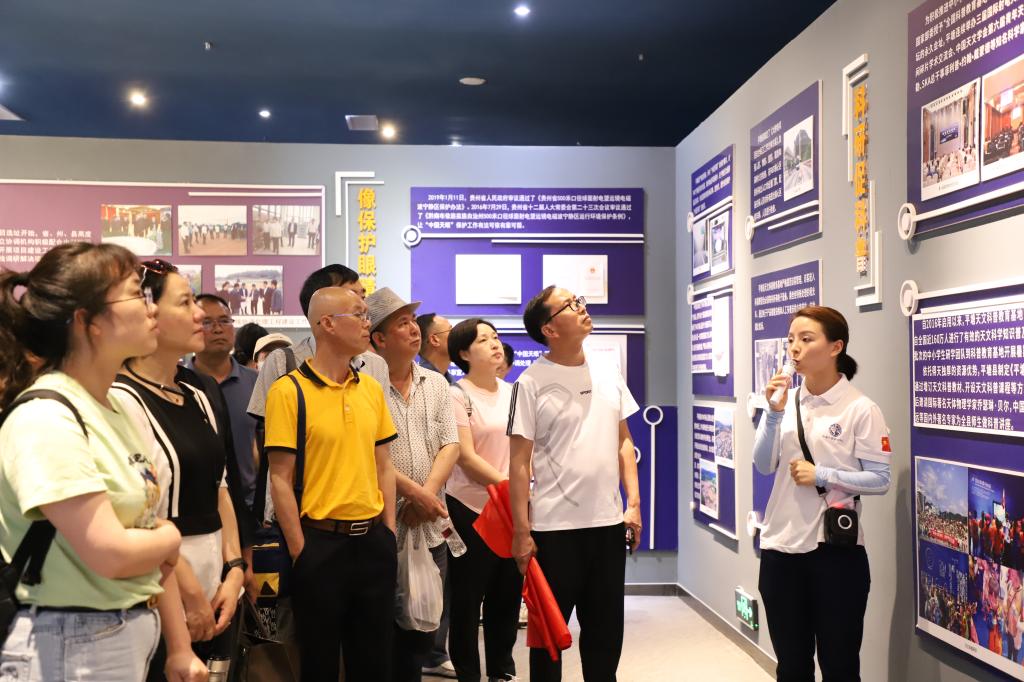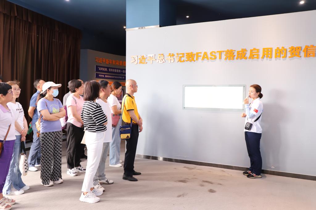 统一战线成员们攀登789道木栈台阶到达观景台纵观天眼全貌,直径500米、30个足球场大的球面望远镜尽收眼底,令大家十分震憾。中国天眼是具有我国自主知识产权、世界最大单口径、最灵敏的射电望远镜FAST,它让中国人首次发现脉冲星,接收到了来自1.6亿光年外的脉冲信号。天眼的修建堪称“中国奇迹”伟大工程,它更好的助力了人类探索宇宙奥秘,它是中国人智慧的骄傲,让祖国成为了世界上看得最远的国家。通过现场参观学习,学校民主党派、统战团体更加深刻领悟了“两个确立”的决定性意义、更加自觉增强“四个意识”、坚定“四个自信”、做到“两个维护”。