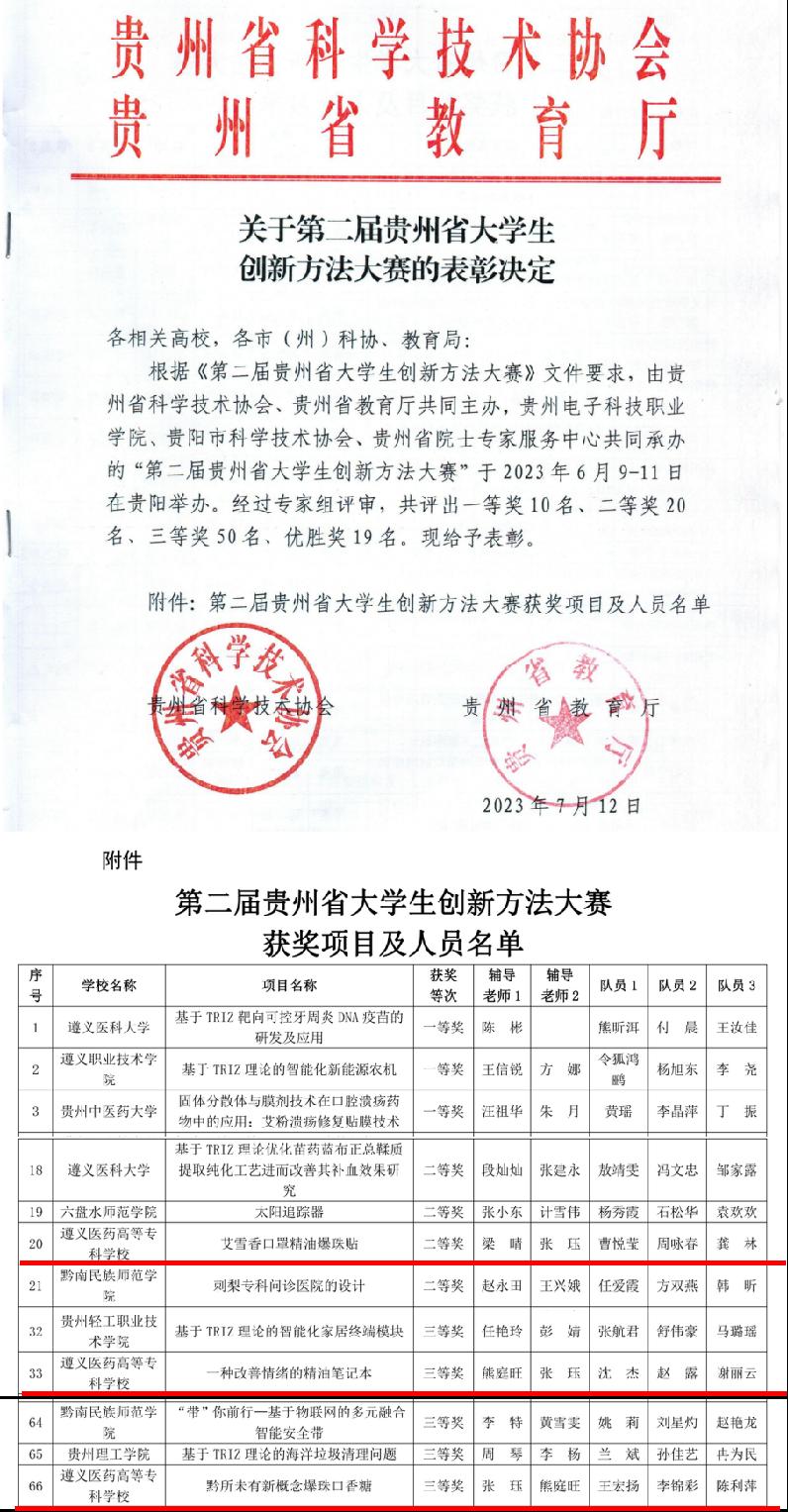 由贵州省科学技术协会、贵州省教育厅共同主办的“第二届贵州省大学生创新方法大赛”于2023年6月9-11日在贵阳举办。经过认真的备赛和激烈的角逐,我校参赛项目,获得“二等奖”1项,“三等奖”2项,其中《艾雪香口罩精油爆珠贴》项目还获得了入围国赛的参赛资格。