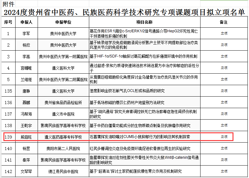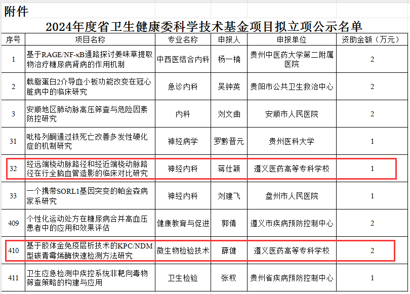 2023年8月,贵州省卫生健康委员会、贵州省中医药管理局分别公布了《2024年度省卫生健康委科学技术基金项目拟立项公示名单》、《2024度贵州省中医药、民族医药科学技术研究专项课题项目拟立项名单》。