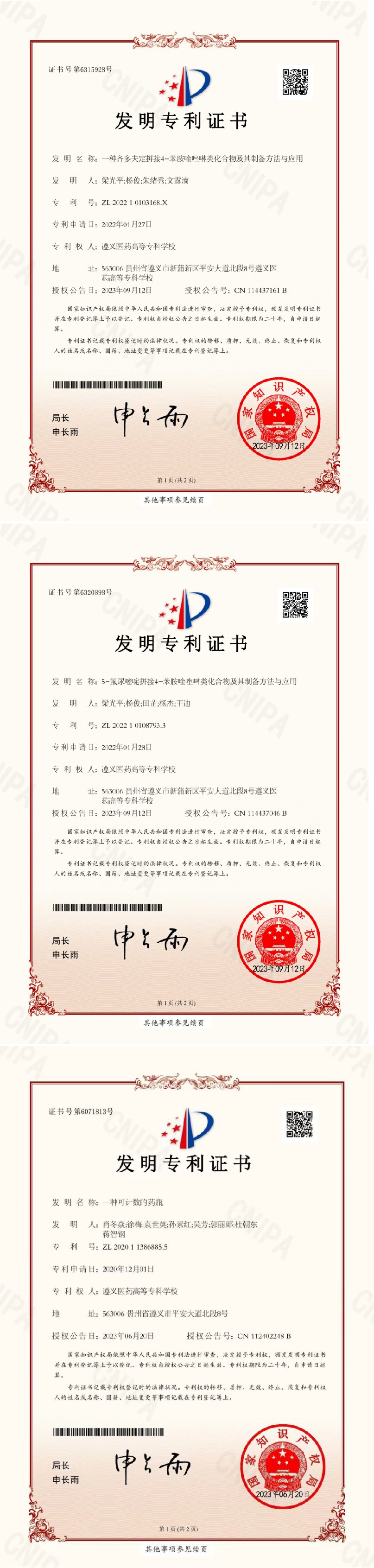 近日,我校梁光平教师申请的《一种齐多夫定拼接4-苯胺喹唑啉类化合物及其制备方法与应用》(专利号:ZL202210103168.X)、《5-氟尿嘧啶拼接4-苯胺喹唑啉类化合物及其制备方法与应用》(专利号:ZL2022 1 0108793.3),以及肖冬焱教师申请的《一种可计数的药瓶》(专利号:ZL202011386885.5),共三项国家发明专利获得授权。