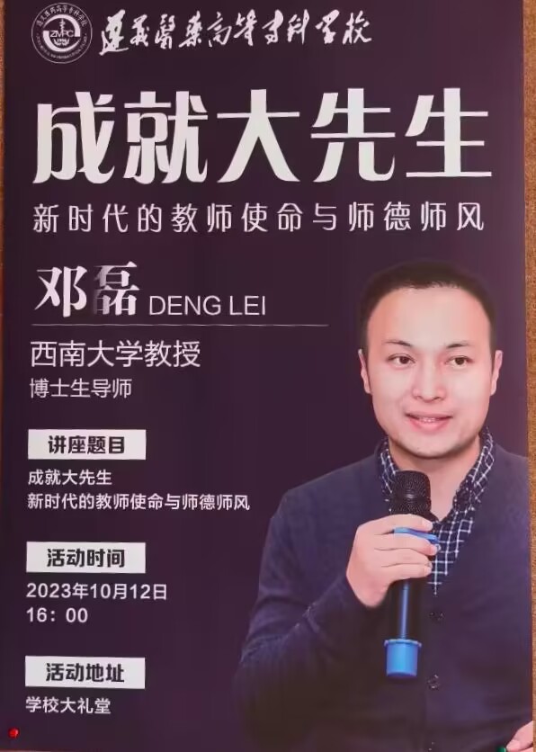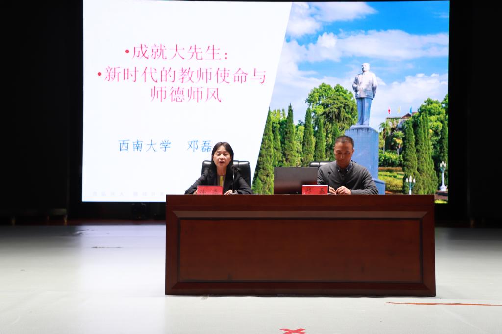 西南大学教师教育学院教授、博士生导师邓磊教授以“成就大先生:新时代的教师使命与师德师风”为题,围绕大先生的内涵与传承、大先生的背景与使命、大先生的师德师风三个方面,从新时代的教育背景出发,用生动的事例阐明何为大先生、如何成为大先生,为学校教师带来深刻的启示。
