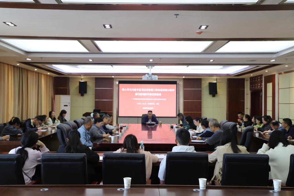俞松以《深入学习习近平总书记对贵州工作的重要指示精神 谱写贵州医学教育新篇章》为题,就如何深入学习贯彻习近平总书记视察贵州重要讲话精神和对贵州工作重要指示批示精神,如何扬优势、补短板,聚焦教育教学、师资队伍、人才培养、科研成果转化等领域,聚力推动学校高质量发展等方面作了深入浅出的讲解。