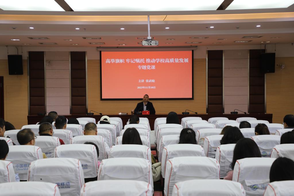 张武晓以《高举旗帜牢记嘱托推动学校高质量发展》为题,从高举中国特色社会主义伟大旗帜,深学笃用习近平总书记视察贵州重要讲话精神和对贵州工作、对遵义工作重要指示批示精神,学习贯彻习近平总书记关于教育的重要论述,如何感恩思进推动学校高质量发展等方面作了详细的讲解。