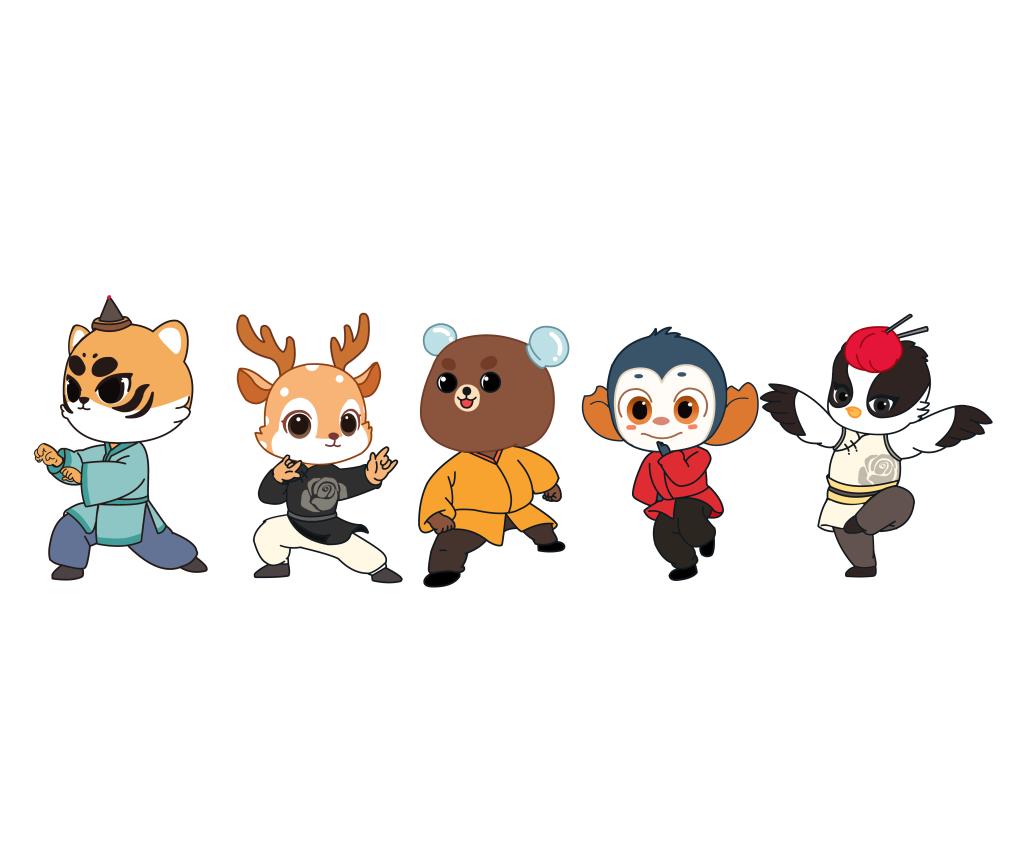 “杏林五宝”以五禽戏五个动物形象为蓝本,巧妙结合中医的拔罐、刮痧、针刺、艾灸和中药五种特色治法,分别以五禽戏中虎、鹿、熊、猿、鸟对应五脏;五脏对应五行;五行对应五色,形成了独特且富有深意的设计体系。